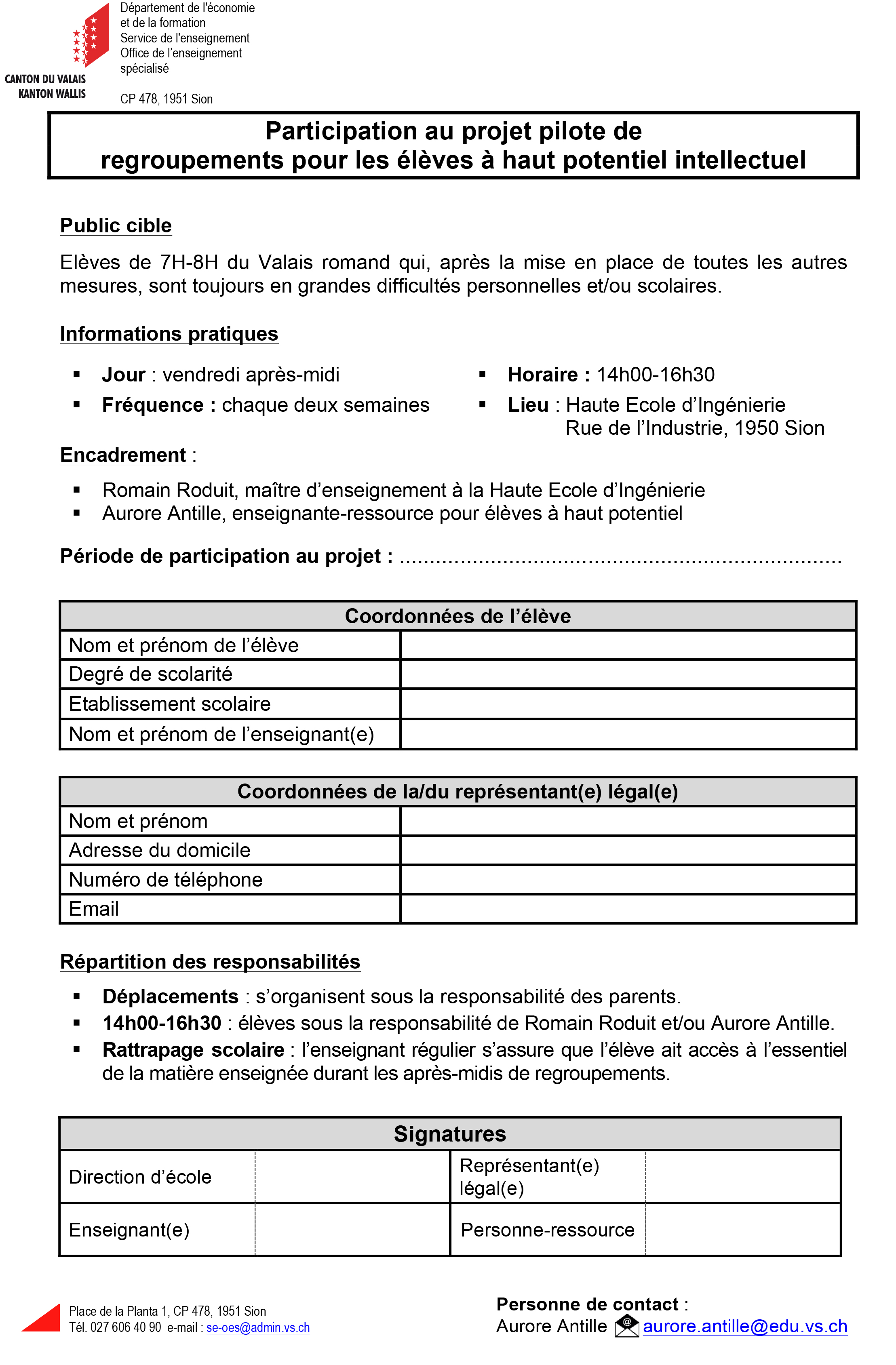 Depuis une quinzaine d’années, le suivi d’enfants HPI est présent dans les écoles du Valais romand. L’Office de l’enseignement spécialisé a mis en place une procédure pour accompagner les enseignants et la classe afin de mieux répondre aux besoins de ce type d’élèves. Actuellement, nous sommes trois enseignantes spécialisées amenées à fonctionner sur mandat des directions et des conseillers pédagogiques, chacune au bénéfice de 4 périodes hebdomadaires. Aurore Antille intervient dans les classes primaires de la ville de Sion, Lucy Escobar et Virginie Sermier Holzer dans le reste du canton romand pour les cycles 1 à 3.